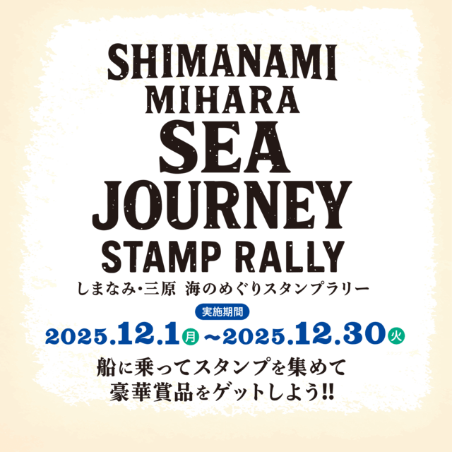 3つの航路を利用して、しまなみ・三原を巡るスタンプラリーです。3つの航路と各地域のスポットを巡りスタンプを集めると、各条件に応じて先着で賞品がもらえます。また条件達成で豪華賞品が当たる抽選に参加できます。船から見る景色の素晴らしさや各地域の魅力をより感じてもらうためにつくられました。
