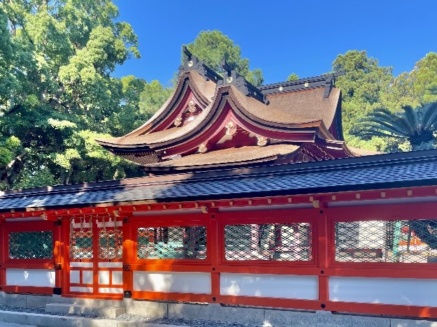 香椎造りで著名な本殿は、享和(きょうわ)元(1801)年に福岡藩10代藩主・黒田斉清(くろだなりきよ)により再建され、国の重要文化財に指定されています。入母屋造平入(いりもやづくりひらいり)に切妻屋根(きりつまやね)が複雑に連結し、正面の大千鳥破風(おおちどりはふ)、左右の車寄せなど、変化に富んだ造りをもつ日本で唯一の建築様式「香椎造り」特徴です。4月と10月中旬に行われる春秋の大祭で奉納される獅子楽(ししがく)は県指定無形民俗文化財です。