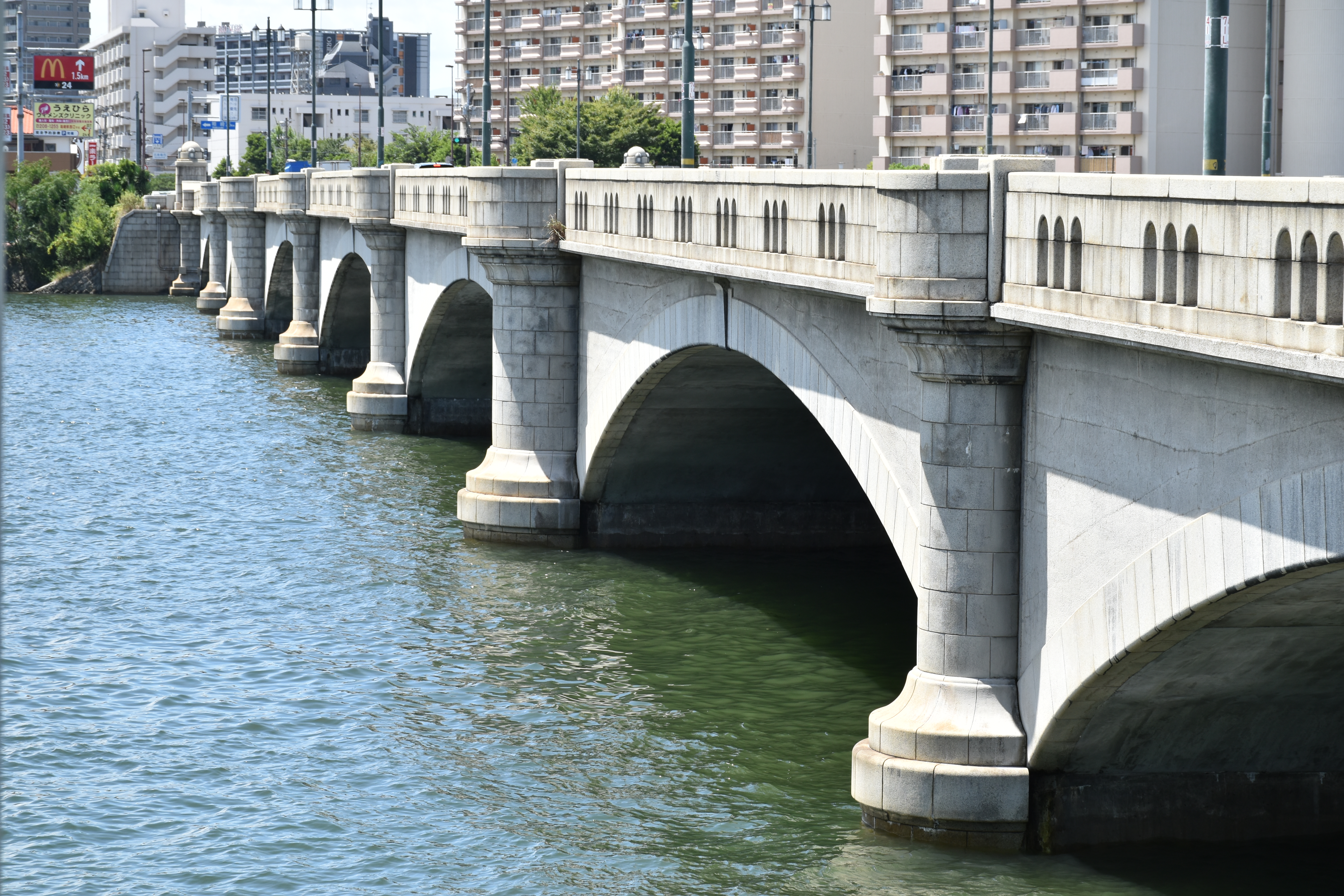 鉄筋コンクリート造七連アーチ橋で、長さ204.1m、幅25.2m。7つの扁平アーチが連続する外観に、半円形の付柱とバルコニー、親柱頂部の半球など、古典的な装飾をバランス良く配置した、長大で、かつ均整のとれた優美なデザインが特徴です。