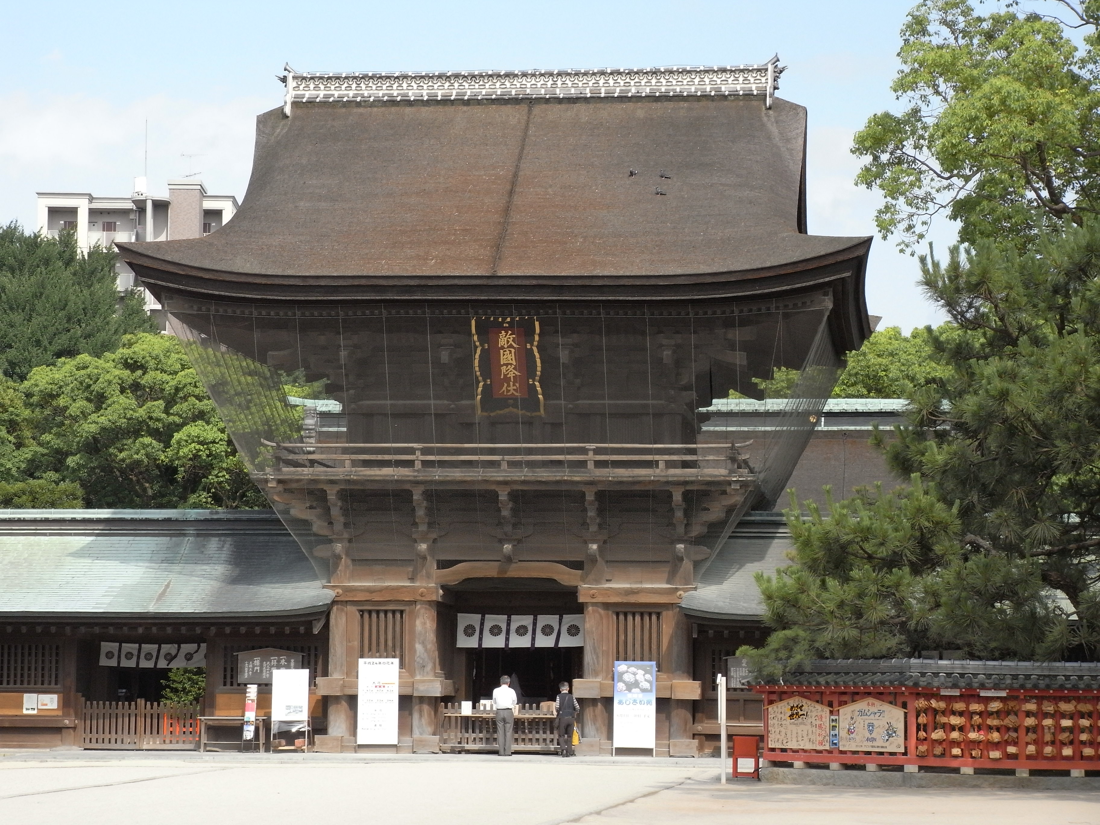 「伏敵門(ふくてきもん)」とも呼ばれる楼門は、名島城主小早川隆景(こばやかわたかかげ)が文禄(ぶんろく)3(1594)年に建立したもので、広大な屋蓋(おくがい)や扉の桐花紋の彫刻に、室町末期の様式を残しています。楼上に揚げられた「敵国降伏」の額は宸翰(しんかん)(天皇の直筆の文書)のうち1葉を模写拡大したもので、文永(ぶんえい)の役(1274)後、社殿再建に尽くした亀山上皇が納めたものと伝えられています。現在の額は平成15年に復原作成されたものです。