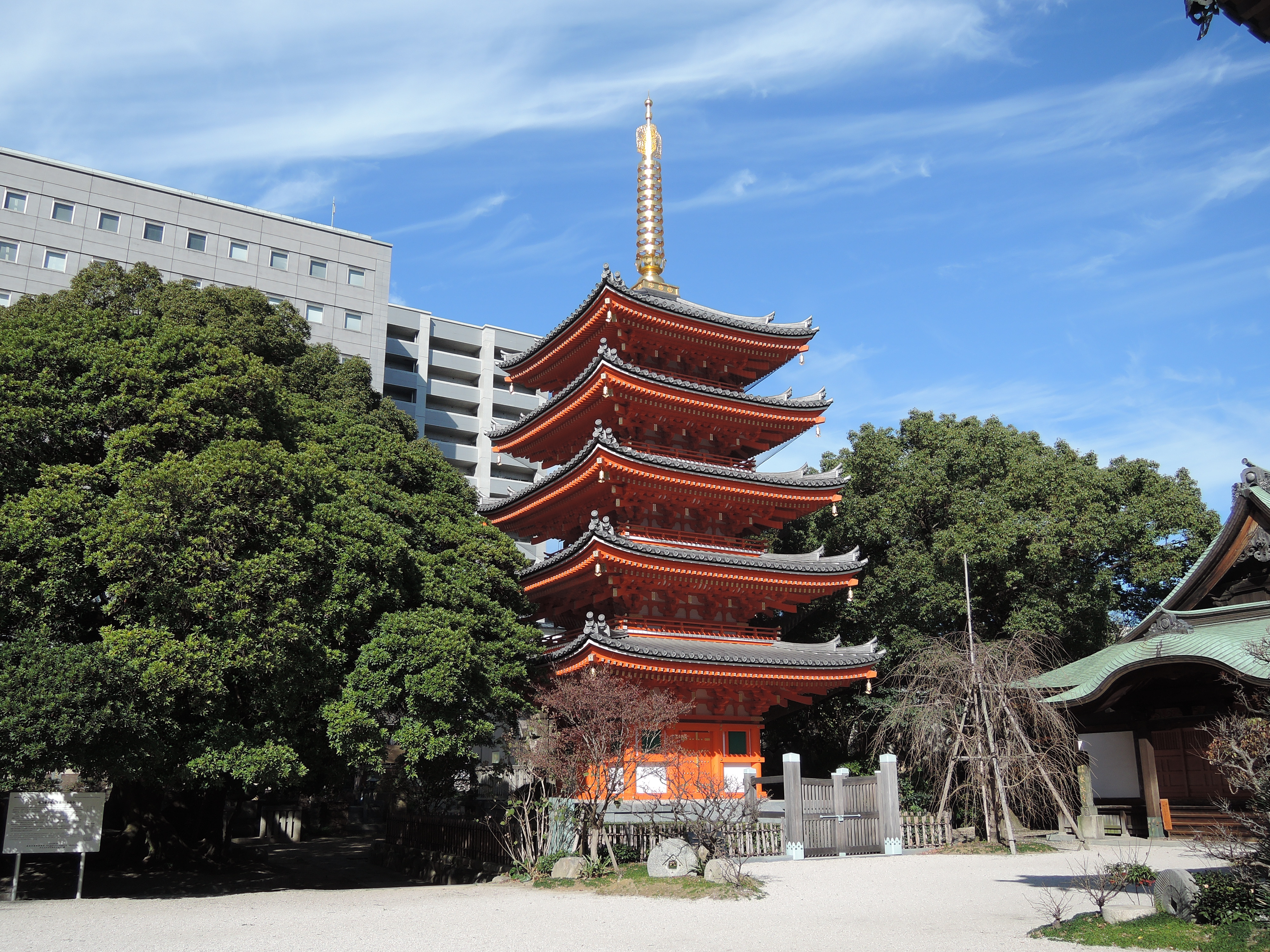 真言宗九州教団の本山。山号は南岳山(なんがくざん)。本尊は弘法大師(こうぼうだいし)。大同(だいどう)元(806)年、唐から帰国した空海(くうかい)(弘法大師)が創建した日本最古の寺で、当初は海辺の地にありましたが、戦火にみまわれたことで福岡藩二代藩主・黒田忠之(くろだただゆき)によって現在地へと移されました。境内には黒田家二代・忠之、三代・光之(みつゆき)、八代・治高(はるたか)の墓があり、現在は市指定の史跡になっています。そのほか、国指定重要文化財の千手観音像(藤原時代)や、市指定有形文化財の六角堂など、多くの文化財を有しています。