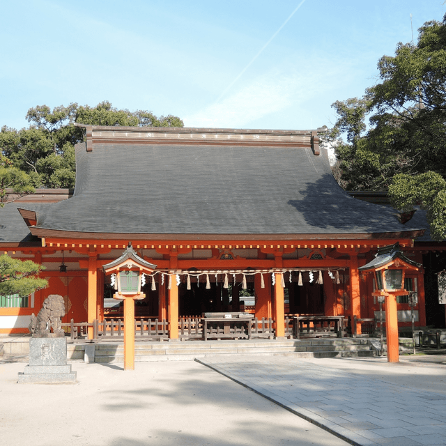 国の重要文化財である本殿は、元和9(1623)年に福岡藩主・黒田長政(くろだながまさ)により再建されました。壁を伝統的な彩色技法である朱と白の胡粉塗(ごふんぬり)で彩り、檜皮葺(ひわだぶき)の屋根は切妻造り妻入りで、直線的な破風(はふ)をもつ本殿は、仏教建築が伝来する前の、古来の神社建築の名残をとどめており、住吉造りと称されています。25年ごとに改築・修理をする式年遷宮が行われており、直近では2010年に遷宮が行われました。その他、能楽殿(のうがくでん)、唐門(からもん)が市指定有形文化財、神社所有の銅戈六口、銅鉾五口は県指定有形文化財となっています。
