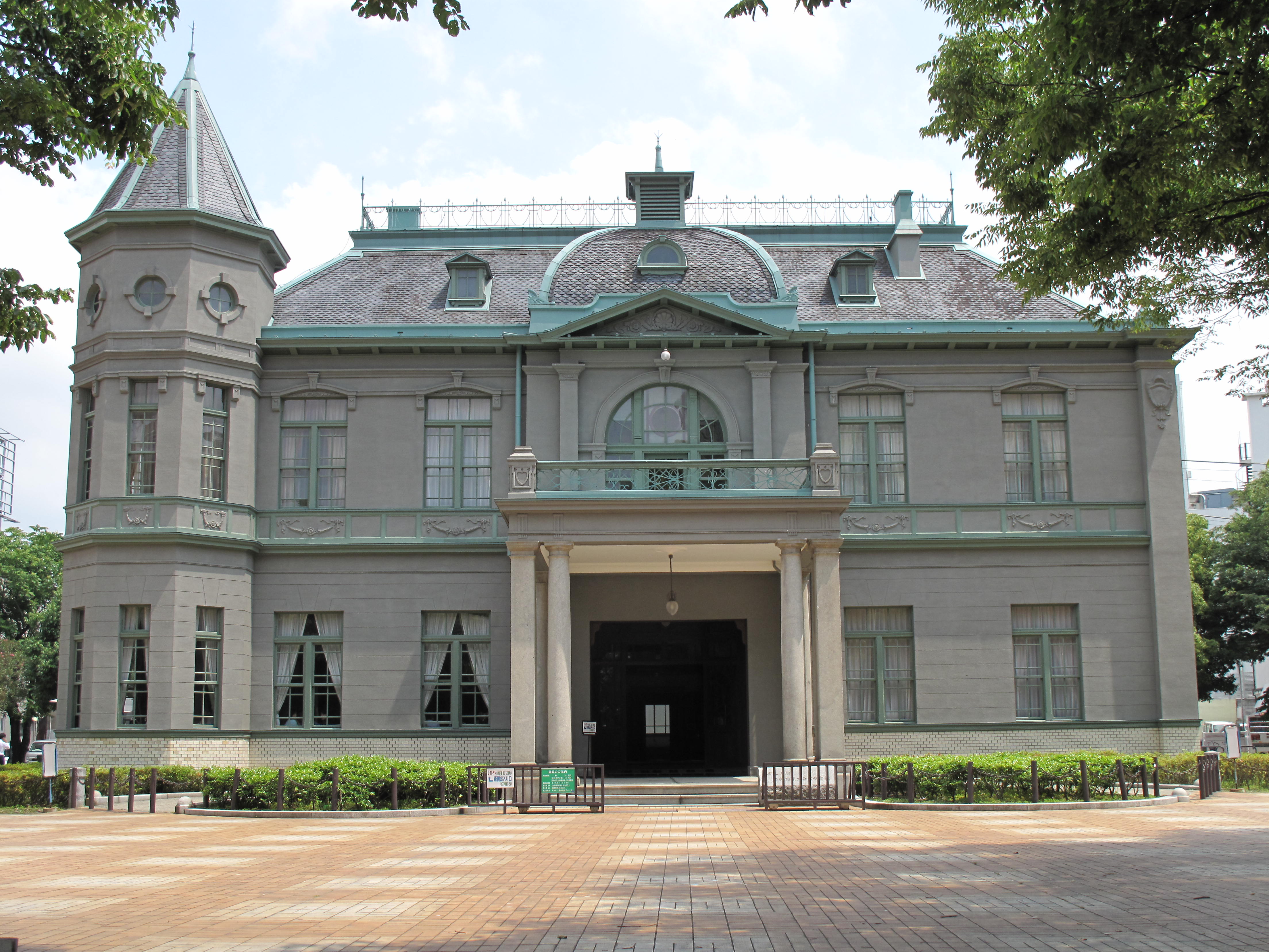 第13回九州沖縄八県連合共進会の開催に際し、会期中の来賓接待所を兼ねて共進会々場東側の現在地に建設されました。明治43(1910)年3月に竣工、同年4月には閑院宮(かんいんのみや)御夫妻の宿泊所として利用されたほか、共進会開催中は来賓を接待しての夜会が催されました。共進会終了後は県の公会堂として一般市民に利用されていましたが、戦後は福岡高等裁判所、県立水産高等学校に転用され、昭和31年11月以降は福岡県教育庁舎として使用されていました。県庁の移転に伴い、跡地内の諸施設の取り壊しが決定しましたが、旧公会堂のうち貴賓館は、数少ない明治時代のフレンチルネッサンスを基調とする木造公共建物として貴重であるため、重要文化財に指定され、現在も天神中央公園の敷地内に保存されています。