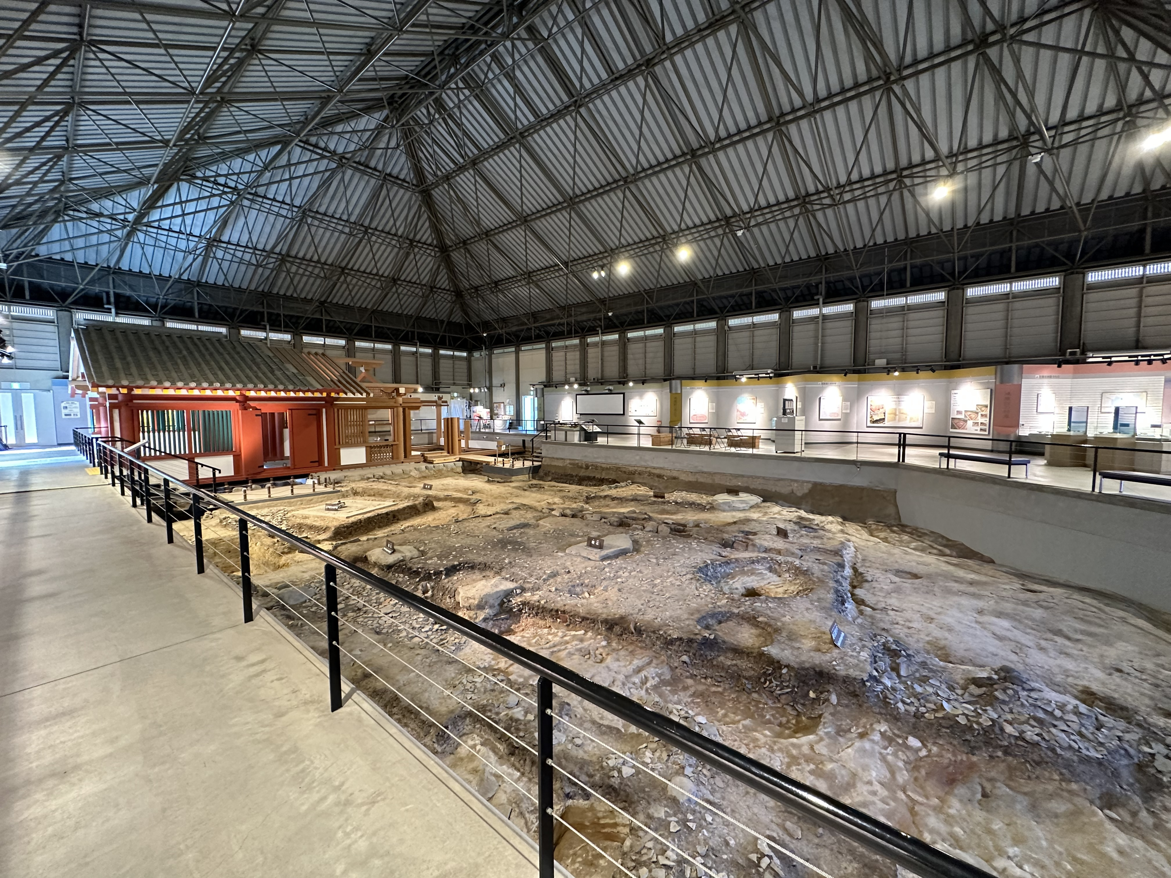 遺構も福岡市による調査が行われており、現在までに奈良時代以前(筑紫館)の塀と門、奈良時代(筑紫館)の塀と掘立柱建物、平安時代の大型礎石建物、土壙(どこう)(穴状の遺構)、溝などが見つかっています。また、多量の瓦類の他、中国越州窯青磁(えっしゅうようせいじ)をはじめ長沙窯磁器(ちょうさようじき)、荊窯白磁(けいようはくじ)、イスラム陶器、西アジアガラス器など国際色豊かな遺物が発掘されています。発掘された遺構や遺物は現在、福岡城内の展示館にて公開されています。発掘当時の様子をそのまま保存した展示は圧巻です。