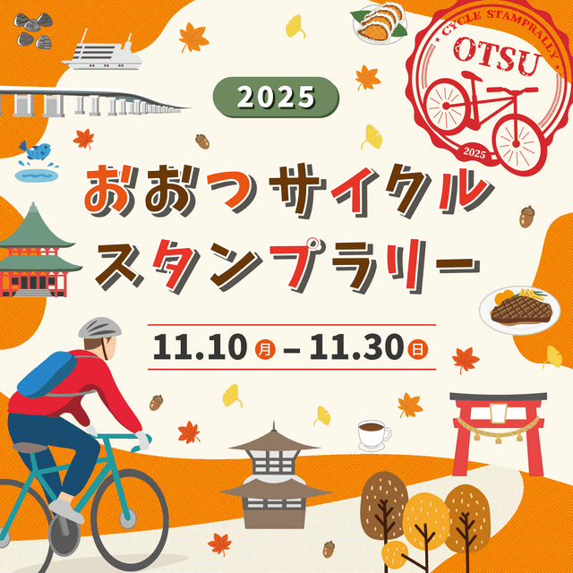 大津市の魅力的な神社仏閣やカフェ、道の駅などを自転車で巡り、デジタルスタンプを集めて応募していただくと、大津市ならではの素敵なサイクリンググッズを、先着順でお渡しいたします。