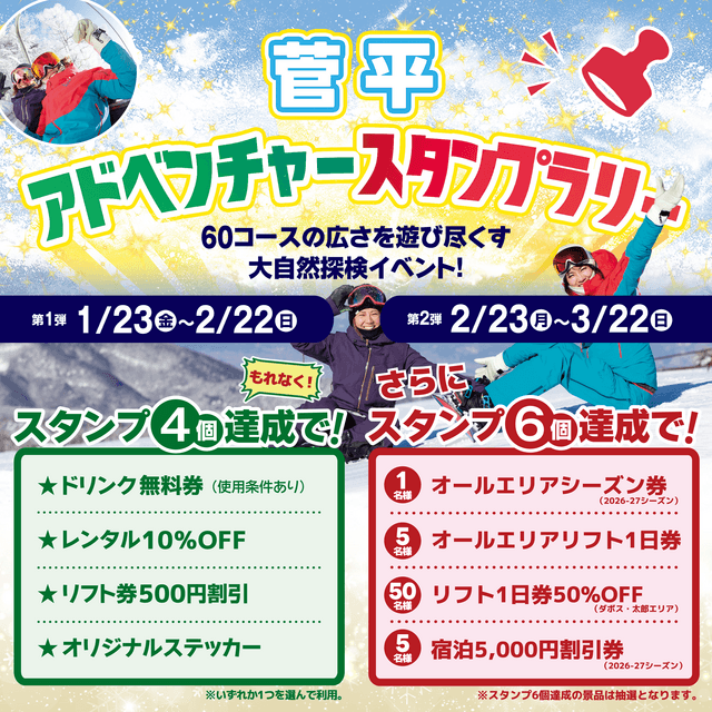 全6個のスタンプをコンプリートすると、抽選で「シーズン券」や「リフト券」、「宿泊割引クーポン」など、豪華景品が当たります✨