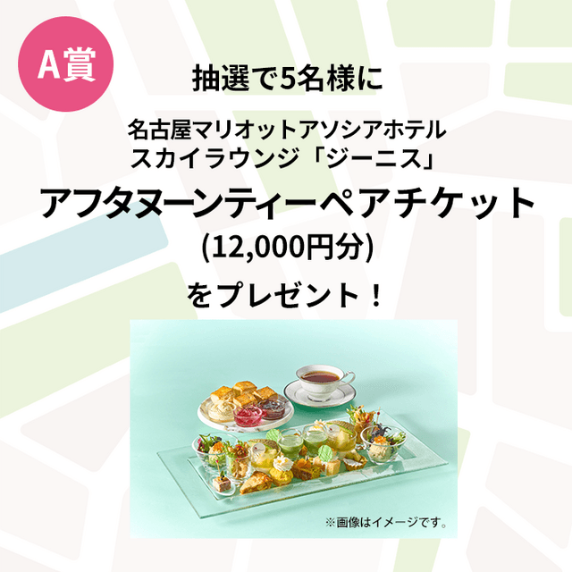 名古屋マリオットアソシアホテル スカイラウンジ「ジーニス」でご利用いただけるアフタヌーンティーペアチケット12,000円分を、抽選で5名様にプレゼントいたします。