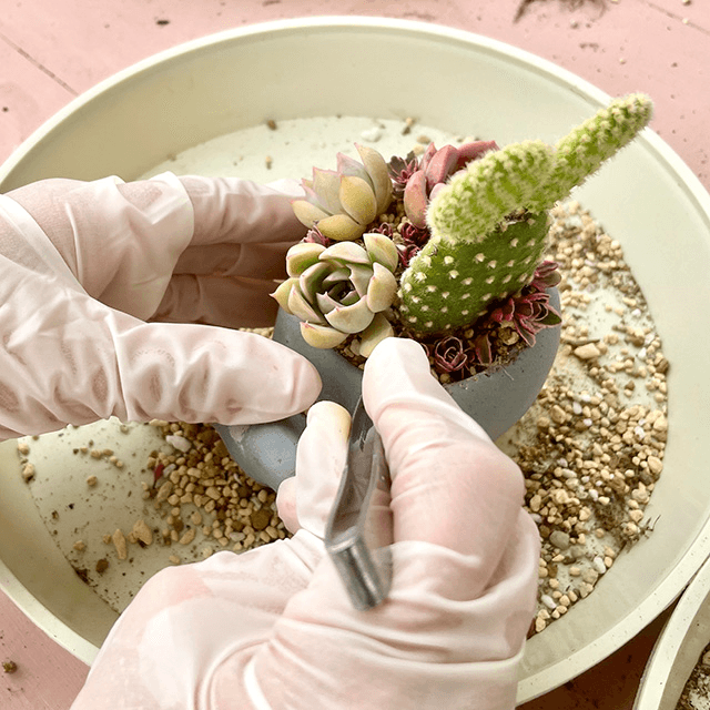 多肉植物の寄せ植え体験。本プログラムでは、寄せ植え体験を楽しみながら但馬の気候に呼応した多肉植物の管理や育て方を学ぶことができます。