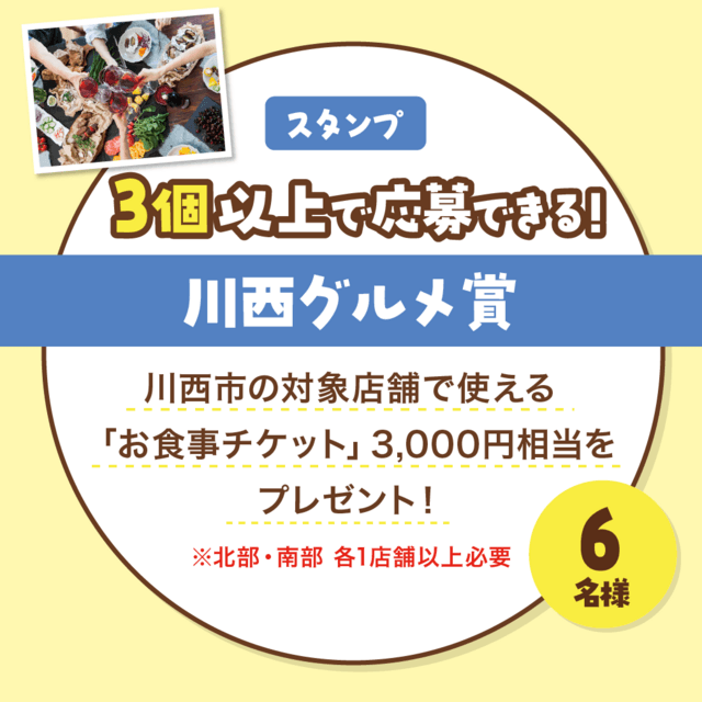 抽選で6名様に、川西市内の対象飲食店で使える「お食事券」3,000円相当をプレゼントいたします!