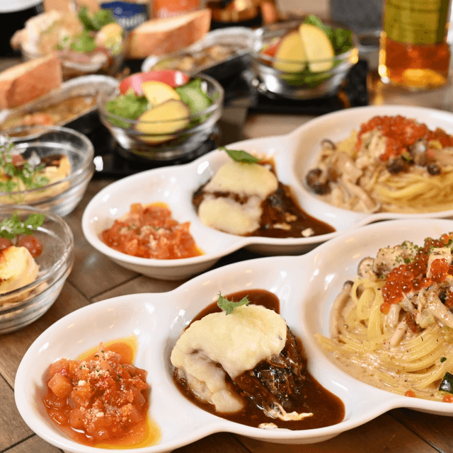川西池田・川西能勢口駅近くのイタリアンバル。自慢はもちもちの生パスタと牛100%のハンバーグ。前菜にはアヒージョなどワインに合うメニューも揃えています。おはしで気軽に楽しめるイタリアンとして、ランチやディナー、女子会やデートにぜひご利用ください。
